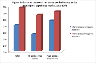 "Cuando estamos a seis meses de las próximas elecciones municipales, un amigo mío metido en política local me contaba ejemplo reales de negociaciones post–elecciones cuando ningún partido había conseguido mayoría absoluta. Para mi sorpresa, ya ven qué ingenuo, las demandas y contraofertas para formar coalición no giraban en torno al programa electoral de cada partido sino básicamente en torno a la obtención de puestos de trabajo con dedicación exclusiva en el consistorio local. Es cierto que la obtención de puestos de trabajo podría ser una manera de conseguir influencia para dirigir las políticas del ayuntamiento hacia un sentido u otro, pero eso no explicaba el abultado incremento en la contratación de personal que resultaba del proceso de negociación de la coalición. No es el objetivo de este blog el relatar los detalles de estos casos particulares sino al contrario tratar de proporcionar datos empíricos y evidencia sobre si esta anécdota sobre el coste en gasto de personal de formar coaliciones es un hecho aislado de un localidad pequeña o verdaderamente representa una fenómeno generalizado en todo el estado español.